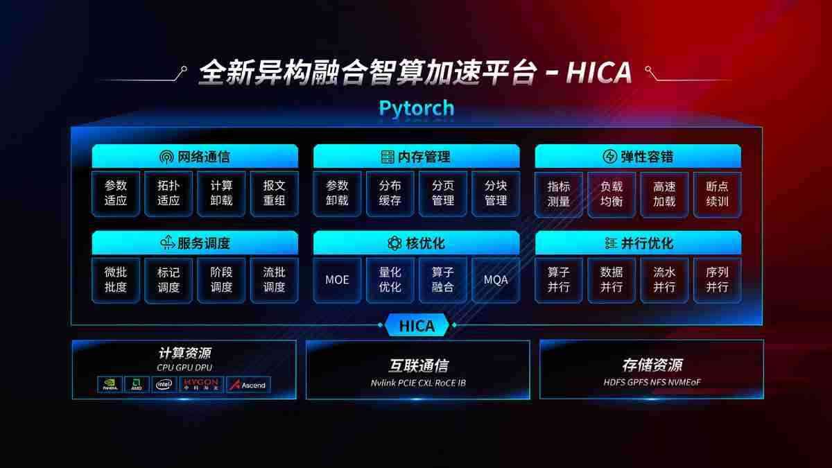 通过自研的服务层、、中间适配层、、、、以及调度编排算法,,,,采用数据并行、、、、模型并行等多种并行方式,,把并行计算任务进行有效的分解,,,,使其分别由相应的软件栈和算力资源来承接。。。当GPU资源变化,,,,HICA可以实时动态调度计算子任务并调整模型拓扑和架构,,,,以充分聚合各种算力资源。。。