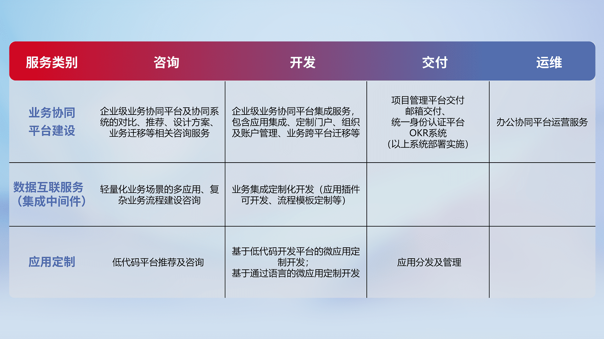 针对钉钉、、、、企微、、、IDaas等平台级产品提供产品的规划、、、方案、、交付、、、、定制化开发等服务,,,,实现如统一协同办公、、智能客户服务、、、混合会议管理、、智能数据查询、、、、等业务场景,,,实现数字化转型。。。。